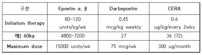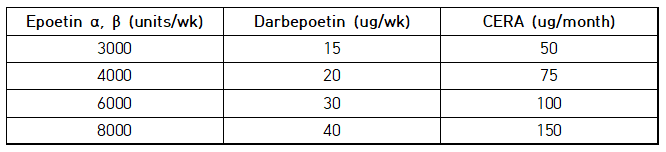 *대략적인 변환 비율 : Epoetin α,β 200U ≈ Darbepoetin 1mcg ≈ CERA 3.5mcg