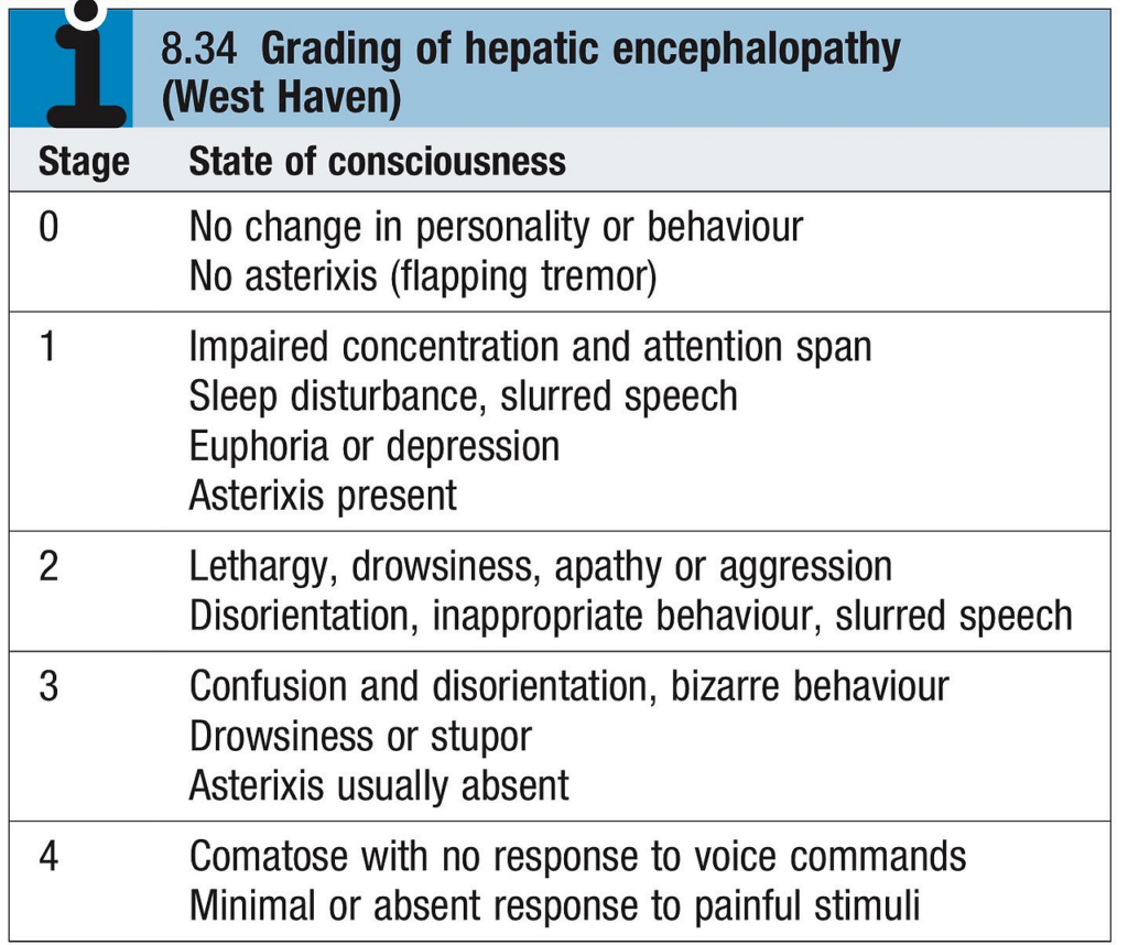 Grade 2 (moderate HE) : leghargy, moderate confusion