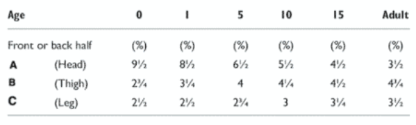 | Lund and Browder Chart (%) | 0~1세 | 1~5세 | 5~10세 | 10~15세 | 15세 이상 | ||