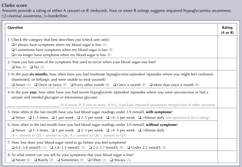 2026-02-192026-02-18 작성자: medcalc kerby Copy URL QR Code QR Code Close 의학계산기 medcalc.co.kr Clarke Score for Impaired Hypoglycaemia Awareness (저혈당무감지증 평가 도구) 아래 문항에 따라 가장 해당하는 보기를 선택해 주세요. 1. 본인을 가장 잘 설명하는 보기를 고르시오. (한 가지만 고르시오.) 나는 혈당이 낮을 때 항상 증상들이 나타난다 나는 혈당이 낮을 때 가끔 증상들이 나타난다 나는 혈당이 낮을 때 더 이상 증상이 나타나지 않는다 2. 기존에 혈당이 낮을 때 발생했던 증상들 중 더 이상 나타나지 않는 증상이 있나요? 그렇다 그렇지 않다 3. 최근 6개월 동안 얼마나 자주 다음과 같은 증상을 동반한 중등도 저혈당을 경험하였습니까? (혼란, 지남력장애, 무기력증, 스스로 몸을 가누지 못함) 전혀 없었다 1회-2회 두달에 한번 매달 한번 한달에 한번 이상 4. 최근 1년 동안 얼마나 자주 다음과 같은 증상을 동반한 중증저혈당을 경험하였습니까? (무의식, 경련, 글루카곤 투여, 포도당 정맥 주사가 필요했던 경우) 전혀 없었다 1회~11회 12회 또는 그 이상 5. 최근 1달 동안 얼마나 자주 증상이 있는 70 mg/dL 미만의 혈당을 경험하였습니까? (증상 있는 저혈당) 전혀 없었다 1회-3회/주 2회-3회/주 4회-5회/주 거의 매일 6. 최근 1달 동안 얼마나 자주 증상이 없는 70 mg/dL 미만의 혈당을 경험하였습니까? (증상 없는 저혈당) 전혀 없었다 1회-3회/주 2회-3회/주 4회-5회/주 거의 매일 7. 증상을 느끼기 전까지 혈당은 어느 정도로 낮았습니까? 60-69 mg/dL 50-59 mg/dL 40-49 mg/dL < 40 mg/dL 8. 본인이 증상을 감지함으로써 저혈당이 발생했다고 느낄 수 있는 증상의 빈도는 어느 정도 입니까? 전혀 느끼지 않음 드물게 가끔 자주 항상 R이 2개 이하 : Normal Awareness R이 3개 : Borderline R이 4개 이상 : Impaired Hypoglycaemia Awareness 관련 계산기를 불러오는 중… 관련 계산기 댓글 총 0개 댓글 작성 0 / 500 수정·삭제 시 비밀번호가 필요합니다. 댓글 등록 댓글을 불러오는 중... 이 페이지에서는 댓글을 사용할 수 없습니다. 비밀번호 확인 취소 확인 댓글 수정 0 / 500 취소 수정 완료