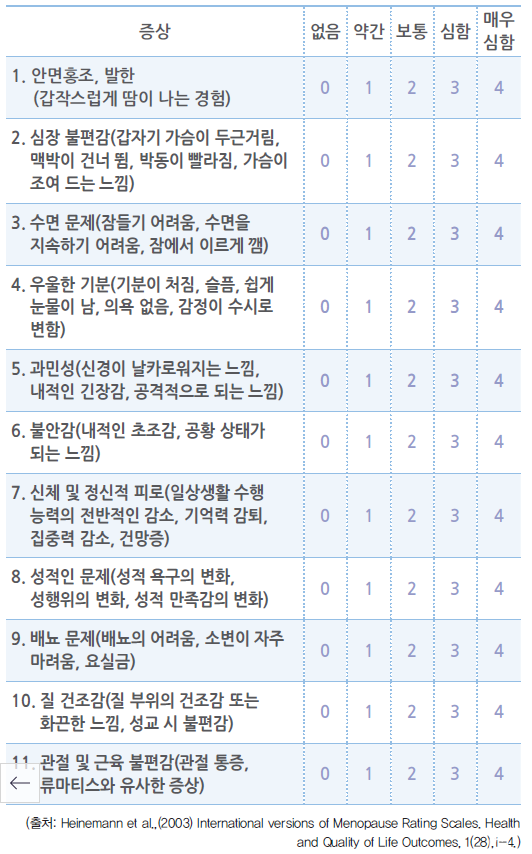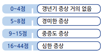2026-02-192026-02-18 작성자: medcalc kerby Copy URL QR Code QR Code Close 의학계산기 medcalc.co.kr 갱년기 증상 평가도구 (Menopause Rating Scale, MRS) 다음 나열된 증상 중 현재 본인에게 해당하는 증상을 선택해주세요. 1. 안면홍조, 발한 (갑작스럽게 땀이 나는 경험) 없음 (0점) 약간 (1점) 보통 (2점) 심함 (3점) 매우심함 (4점) 2. 심장 불편감 (갑자기 가슴이 두근거림, 맥박이 건너 뜀, 박동이 빨라짐, 가슴이 조여 드는 느낌) 없음 (0점) 약간 (1점) 보통 (2점) 심함 (3점) 매우심함 (4점) 3. 수면 문제 (잠들기 어려움, 수면을 지속하기 어려움, 잠에서 이르게 깸) 없음 (0점) 약간 (1점) 보통 (2점) 심함 (3점) 매우심함 (4점) 4. 우울한 기분 (기분이 쳐짐, 슬픔, 쉽게 눈물이 남, 의욕 없음, 감정이 수시로 변함) 없음 (0점) 약간 (1점) 보통 (2점) 심함 (3점) 매우심함 (4점) 5. 과민성 (신경이 날카로워지는 느낌, 내적인 긴장감, 공격적으로 되는 느낌) 없음 (0점) 약간 (1점) 보통 (2점) 심함 (3점) 매우심함 (4점) 6. 불안감 (내적인 초조감, 공황상태가 되는 느낌) 없음 (0점) 약간 (1점) 보통 (2점) 심함 (3점) 매우심함 (4점) 7. 신체 및 정신적 피로 (일상생활 수행능력의 전반적인 감소, 기억력 감퇴, 집중력 감소, 건망증) 없음 (0점) 약간 (1점) 보통 (2점) 심함 (3점) 매우심함 (4점) 8. 성적인 문제 (성적 욕구의 변화, 성행위의 변화, 성적 만족감의 변화) 없음 (0점) 약간 (1점) 보통 (2점) 심함 (3점) 매우심함 (4점) 9. 배뇨 문제 (배뇨 어려움, 소변이 자주 마려움, 요실금) 없음 (0점) 약간 (1점) 보통 (2점) 심함 (3점) 매우심함 (4점) 10. 질 건조감 (질 부위의 건조감 또는 화끈한 느낌, 성교시 불편감) 없음 (0점) 약간 (1점) 보통 (2점) 심함 (3점) 매우심함 (4점) 11. 관절 및 근육 불편감 (관절 통증, 류마티스와 유사한 증상) 없음 (0점) 약간 (1점) 보통 (2점) 심함 (3점) 매우심함 (4점) 관련 계산기를 불러오는 중… 관련 계산기 댓글 총 0개 댓글 작성 0 / 500 수정·삭제 시 비밀번호가 필요합니다. 댓글 등록 댓글을 불러오는 중... 이 페이지에서는 댓글을 사용할 수 없습니다. 비밀번호 확인 취소 확인 댓글 수정 0 / 500 취소 수정 완료