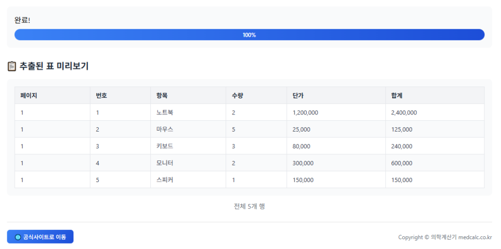 - 표 미리보기 – 추출된 표를 미리 확인할 수 있습니다.