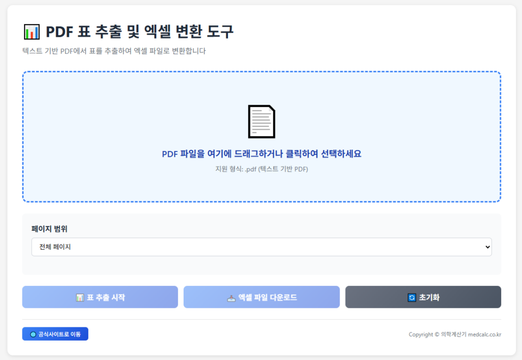 PDF 표 추출 도구는 PDF 파일에 있는 표를 자동으로 인식하고 엑셀 파일(.xlsx)로 변환해주는 무료 프로그램입니다. 복잡한 PDF에서 표를 하나하나 복사하거나 수동으로 입력할 필요 없이, 몇 번의 클릭만으로 모든 표를 엑셀 파일로 변환할 수 있습니다.