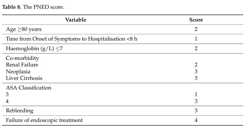 Marmo R, Koch M, Cipolletta L, Capurso L, Pera A, Bianco MA, Rocca R, Dezi A, Fasoli R, Brunati S, Lorenzini I, Germani U, Di Matteo G, Giorgio P, Imperiale G, Magnolfi F, Pietropaolo V, Testoni PA, Triossi O, Zambelli A, Amato A, Andriulli A, Rotondano G; Italian Registry on Upper Gastrointestinal Bleeding (PNED 1 and PNED 2 Investigators). Predicting mortality in non-variceal upper gastrointestinal bleeders: validation of the Italian PNED score and prospective comparison with the Rockall Score. Am J Gastroenterol. 2010 Jun;105(6):1284-91. doi: 10.1038/ajg.2009.687. Epub 2010 Jan 12. PMID: 20068560.