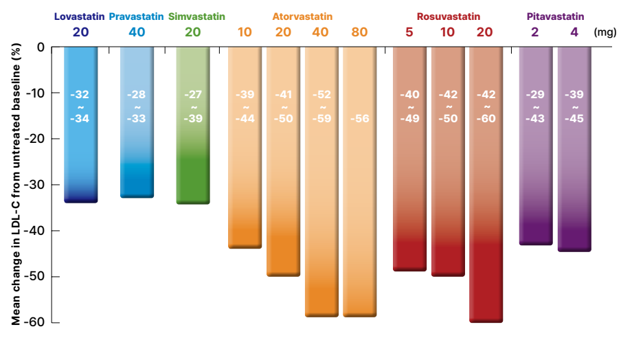 - High potency: LDL-C 감소율 49-63% (Atorvastatin, Rosuvastatin, Ezetimibe 복합제)