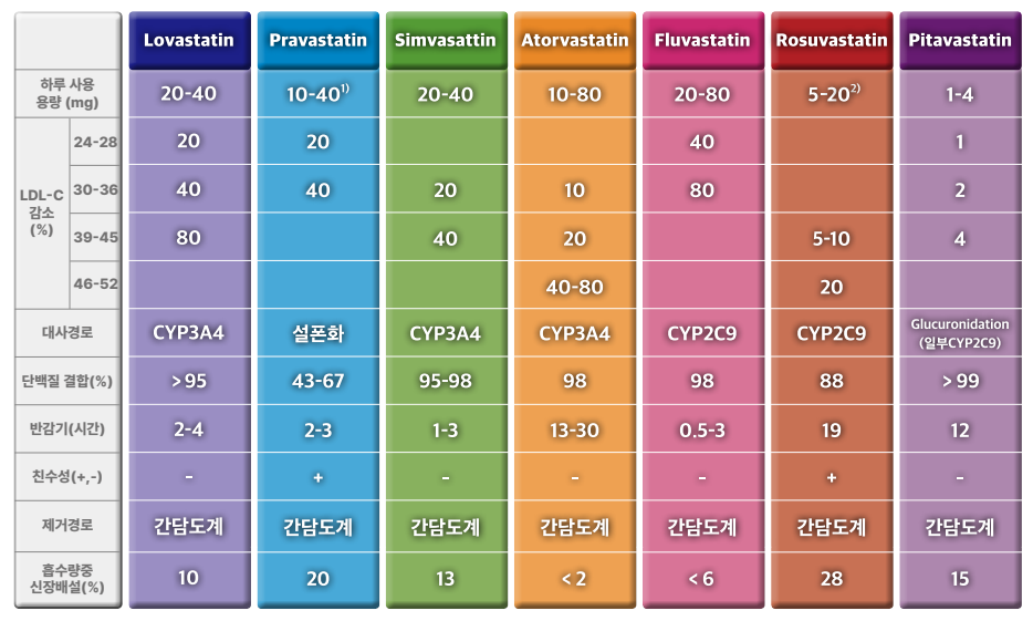 - Medium potency: LDL-C 감소율 20-43% (Simvastatin, Pravastatin, Lovastatin)