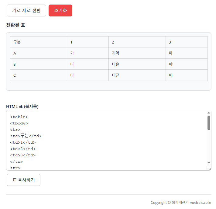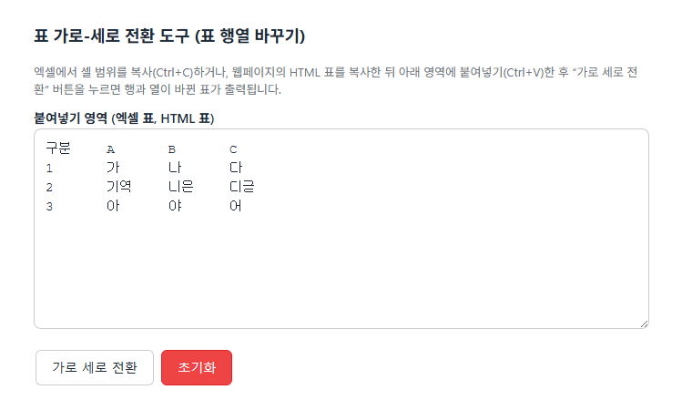 엑셀에서 셀 범위를 복사(Ctrl+C)하거나, 웹페이지의 HTML 표를 복사한 뒤 아래 영역에 붙여넣기(Ctrl+V)한 후 “가로 세로 전환” 버튼을 누르면 행과 열이 바뀐 표가 출력됩니다.